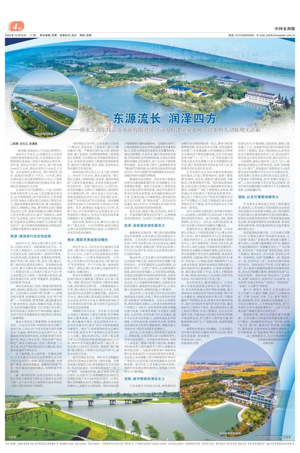 從2004年10月掛牌成立,十余人的團隊發(fā)展為現(xiàn)有職工近600人的創(chuàng)新型水利企業(yè),20年篳路藍縷、20年春華秋實,江蘇水源公司作為南水北調(diào)東線江蘇境內(nèi)工程項目法人,錨定高質(zhì)量發(fā)展首要任務(wù),著力提高核心競爭力,增強核心功能,勇當南水北調(diào)工程建設(shè)運營主力軍、國家水網(wǎng)建設(shè)先鋒隊和服務(wù)江蘇水利事業(yè)排頭兵,踐行“東源流長,潤澤四方”企業(yè)使命,站在“守護生命線”的政治高度,扛起南水北調(diào)事業(yè)發(fā)展的“江蘇使命”“源頭擔當”,奮力在服務(wù)和構(gòu)建國家水網(wǎng)及南水北調(diào)新發(fā)展格局中展現(xiàn)更大作為。